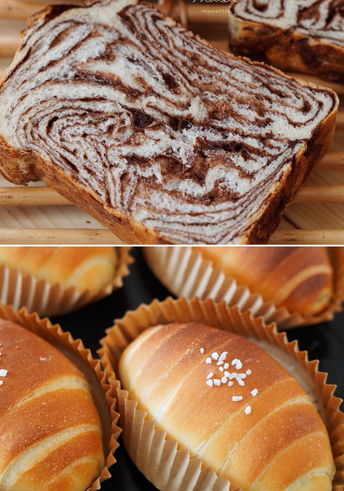 この体験レッスンではセミドライイーストを使い、【ショコラマーブル食パン】と【塩パン】を作っていただきます。